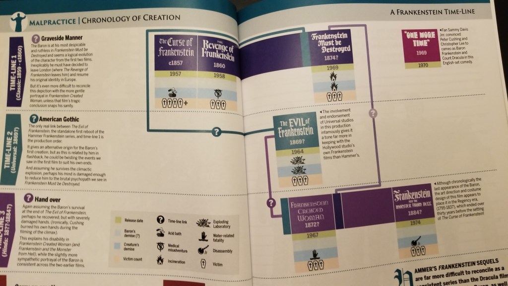 Let’s deal with the second one first.  An infographic, simply, is a way to display data visually.  So, let’s say that you have read a lot about Hammer’s celebrated Frankenstein cycle, maybe even having read Bruce G. Hallenbeck’s excellent The Hammer Frankenstein– and if you haven’t read that one, you should.  But I will agree with the suggestion that I just made up for you, that you are well read on the subject of Hammer Studios, having ingested a lot of data about these films.  But the infographics inside Infogothic allow you to contextualize that data, seeing relationships that help explain chronology, thematics, and story concepts in ways that you really haven’t encountered or considered before.  Take this page, called The Chronology of Creation:
