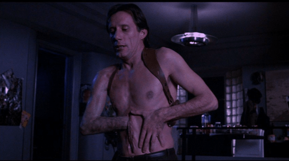 The Thing and Videodrome are both films which use cinematic language expertly, both evoking gut-wrenching in scenes of gore and body horror, as well as a more reflective feeling of existential horror. While I’m deeply interested in the larger cultural conversation which both films broach, I don’t believe I would be able to dig in without addressing their expert use of film elements and love for cinema. The Thing is the pinnacle of a Lovecraftian horror film, which is essentially an imagining of what scared, vulnerable humans may experience upon the first encounter with an extraterrestrial. Oh, yeah, and it can disguise itself in minutes with the form of any creature it consumes. Light plays an instrumental role in creating and maintaining an atmosphere of paranoia and fear in the film. A deep, glowing blue light blares into the camera, coloring the snow and creeping through every window of the research base. Blue light is known to inhibit the production of melatonin in humans, and just as we are unable to close our eyes for more than a moment, the characters are sleep deprived and anxiety is heightened (Harvard Health). Look away for even a moment, and anyone could be an imposter. The blue light seems omnipresent, but it is juxtaposed with the large gaps of light which rest heavy on the compound. In one shot, the protagonist McReady sits in a slice of light at his desk, swallowed from the sea of shadow behind him. The long and pointed shadow that dominates the frame lingers with a burning question… what could be lurking unseen in that hallway? It does seem pointedly ironic that in the cold bright snowscape just outside, there would be no question about who the imposter is. Yet, in the warm confines of the base there are corners and shadows which unknown events transpire behind. One cannot leave the elephant in the room unaddressed –or should I say the oozing, bleeding, actively-mutating, shape-shifting, and horrifying (for lack of a better word) thing in the room.