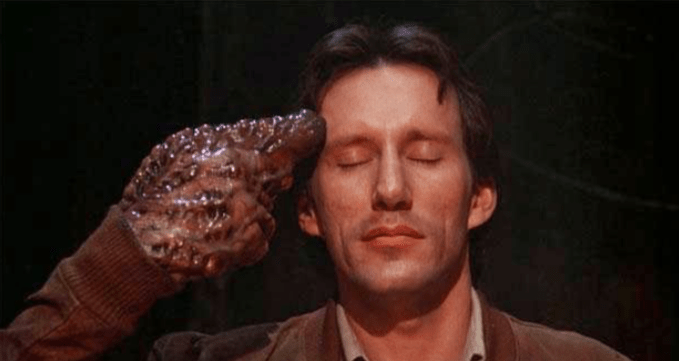 Narratively, this film is fairly typical in that the plot exists within the boundaries of the frame, and these characters are isolated from us and others in space and on screen. This is largely different from the experimental narrative of Videodrome, which almost feels like a videogame. Much like a role-playing-game (RPG) the viewer is simultaneously a passive and active participant in the narrative, yet physically distanced from the medium. This chillingly prescient film is a warning, or perhaps an exploration, of the dangers of humanity’s relationship with video. More generally, it is about a controlling television media executive who discovers the violent outlet Videodrome. The violence is thought to be a facade, acting, and distant from the reality it portrays. But the sinister organization is responsible for these crimes which have crept into the media, or perhaps the opposite. Screens are omnipresent in the film, and protagonist Max quickly figures out that the organization and these videos are malevolent projections which will soon materialize in his world. The plot is less concrete and more surreal than that of The Thing, which may actually increase its effect. The reality of the characters is shaped by their media, and vice versa. Max is woken and spoken to by his television, and he in return curates the television channel which he corrupts with Videodrome’s violence and message. As soon as he violates their private transmission and broadcasts it, Videodrome hacks him to corrupt with violence and their message. Every manipulation of media returns tenfold to the characters, and it feels like a dialogue between the two. In light of VR, there is an image of Max’s visions of sex and violence projected into a machine not unlike a VR headset to become manifest in video. Both sex and the corporeal body are eviscerated by the merging of technology and humanity in the film. Body horror and sexual horror are two large components of the film. Bodies are corrupted with tumors of new flesh, and sex becomes a deformed, simulated rape by technology.